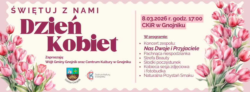 Wójt Gminy Gnojnik oraz Centrum Kultury w Gnojniku zapraszają na uroczyste obchody Dnia Kobiet, które odbędą się 8 marca 2026 roku o godz. 17:00 w CKiR w Gnojniku.