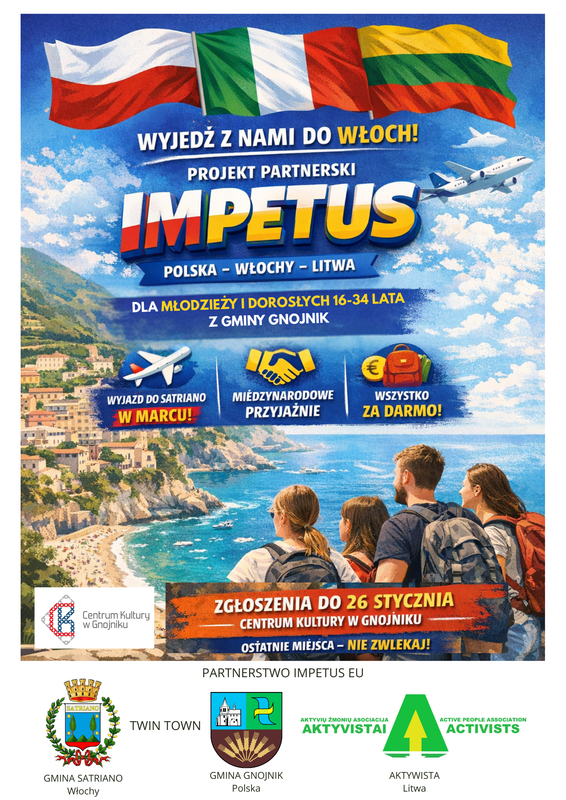 Zapraszamy młodych mieszkańców gminy Gnojnik w wieku od 16 do 34 lat do udziału w tym wyjątkowym przedsięwzięciu. Projekt Impetus to nie tylko wyjazd za granicę – to okazja, by poznać włoską kulturę „od środka”, zdobyć nowe doświadczenia, nawiązać międzynarodowe przyjaźnie i rozwijać swoje kompetencje społeczne. To świetny sposób, by poszerzyć horyzonty, wzmocnić pewność siebie i aktywnie uczestniczyć w inicjatywach europejskich.